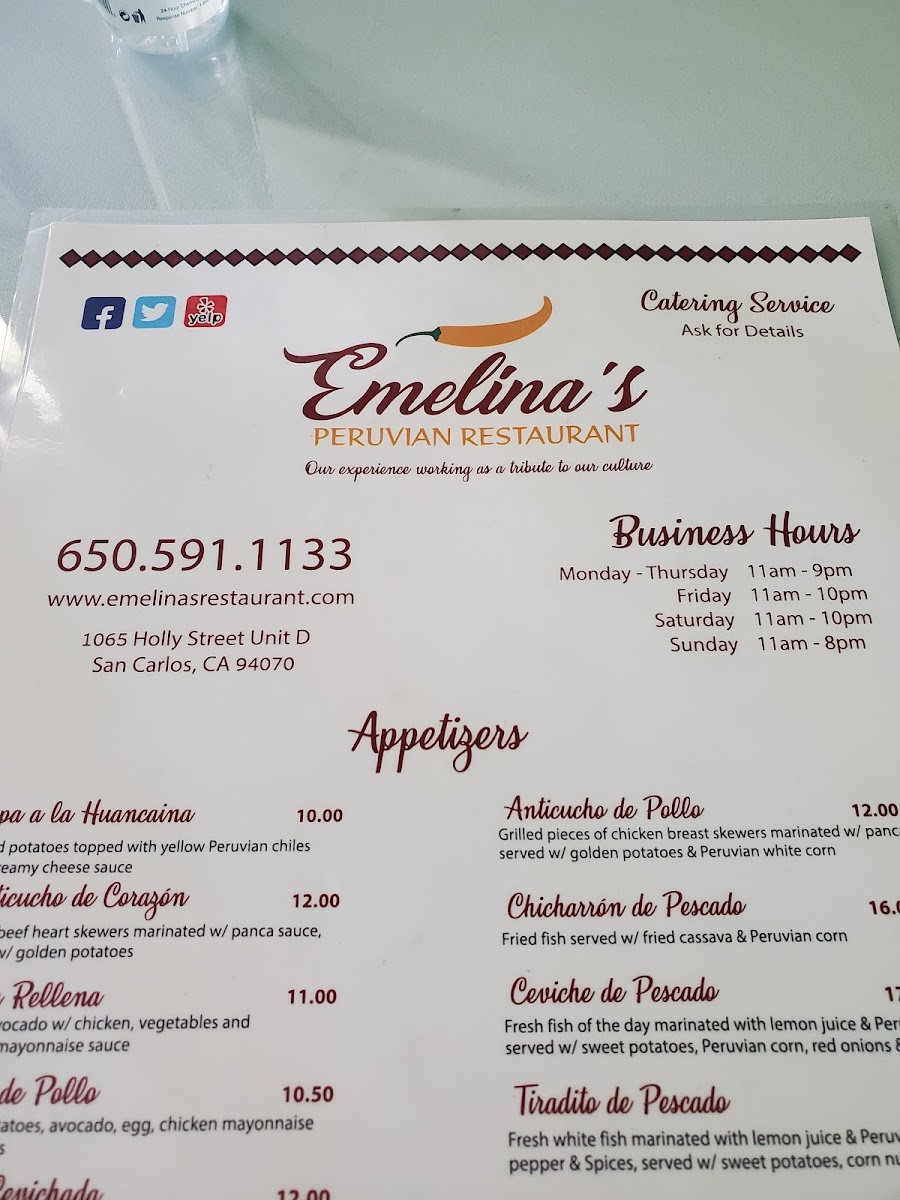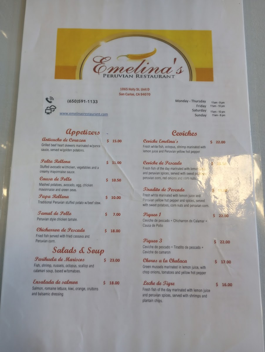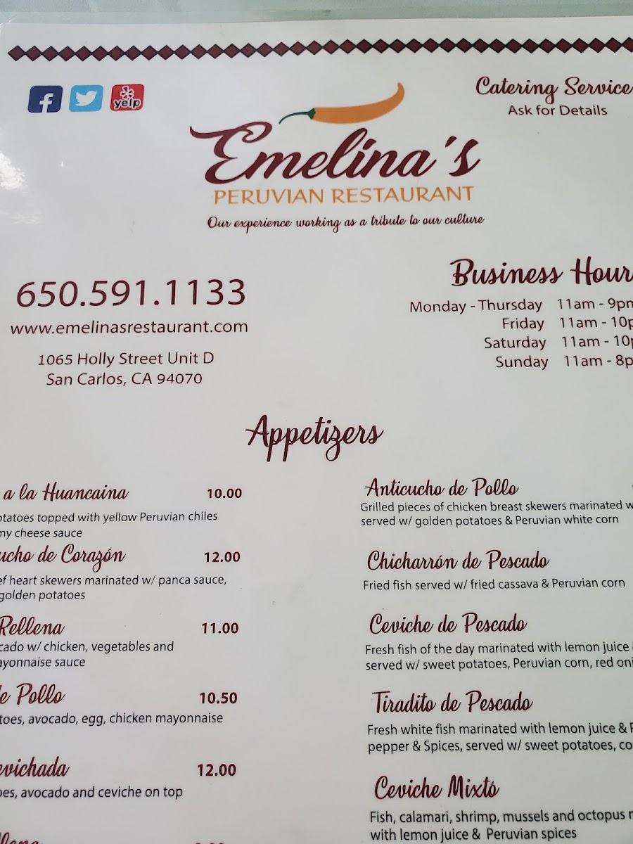 If you’re curious about what to expect from the Emelinas Peruvian Restaurant Menu, get ready for a lineup that feels both comforting and exciting at the same time. Tucked away at 1065 Holly St D in San Carlos, this spot brings together bold Peruvian flavors with dishes that are easy to fall in love with. You’ll find classics like ceviche bursting with citrus and spice, tender lomo saltado served sizzling with fries and rice, and rich, slow-cooked stews that taste like they’ve been perfected over generations.