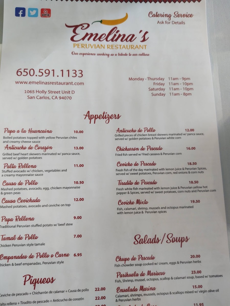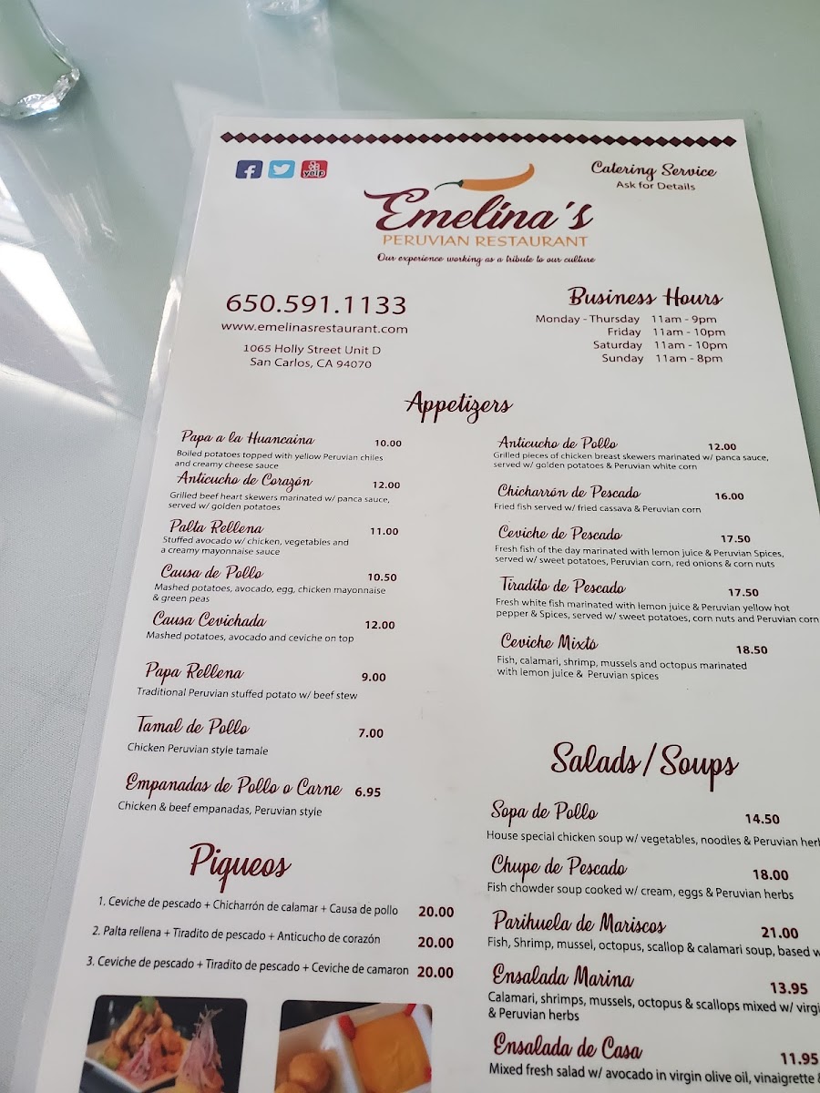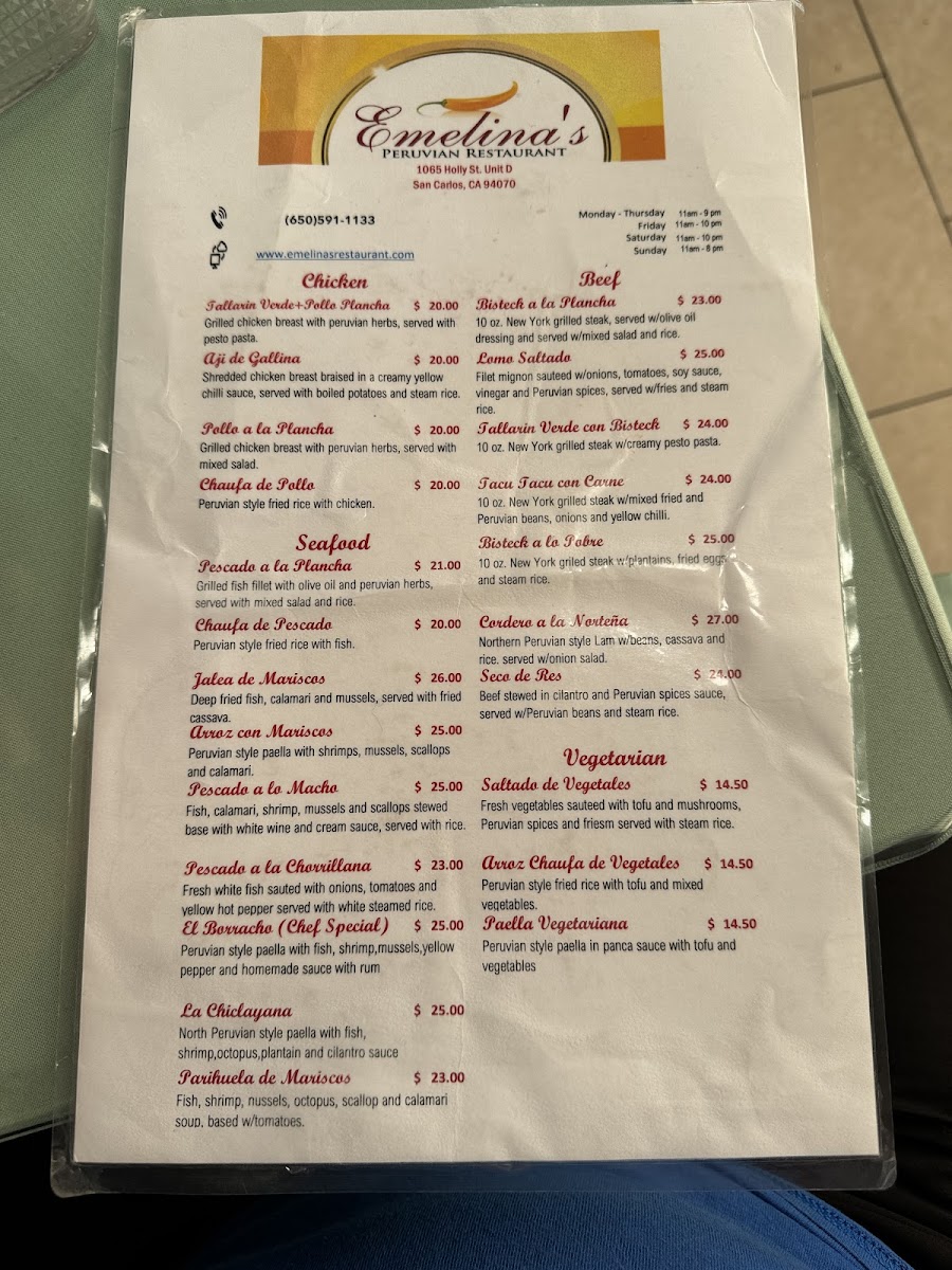 If you’re curious about what to expect from the Emelinas Peruvian Restaurant Menu, get ready for a lineup that feels both comforting and exciting at the same time. Tucked away at 1065 Holly St D in San Carlos, this spot brings together bold Peruvian flavors with dishes that are easy to fall in love with. You’ll find classics like ceviche bursting with citrus and spice, tender lomo saltado served sizzling with fries and rice, and rich, slow-cooked stews that taste like they’ve been perfected over generations.